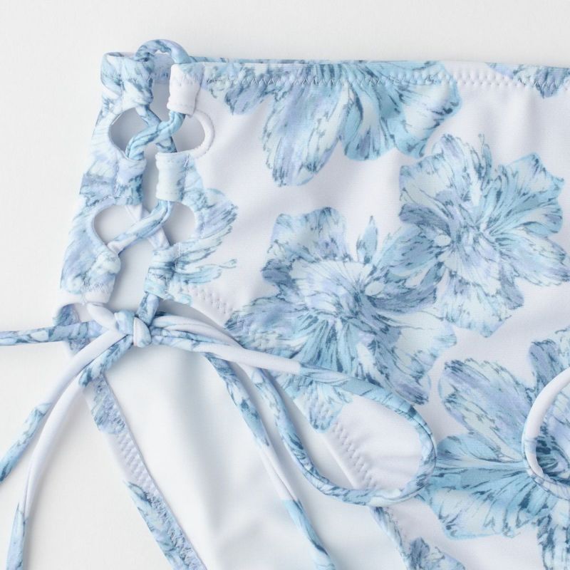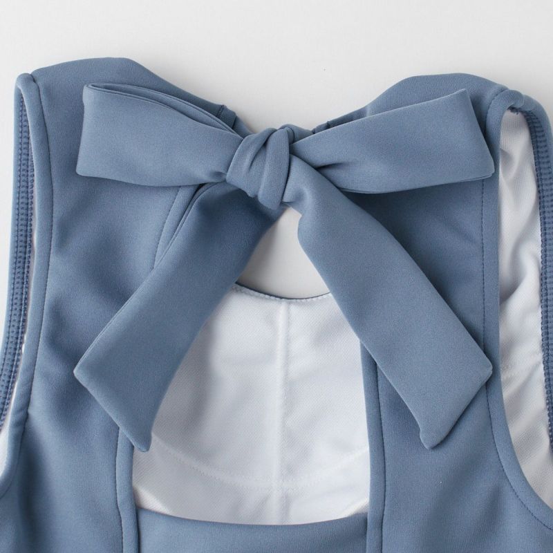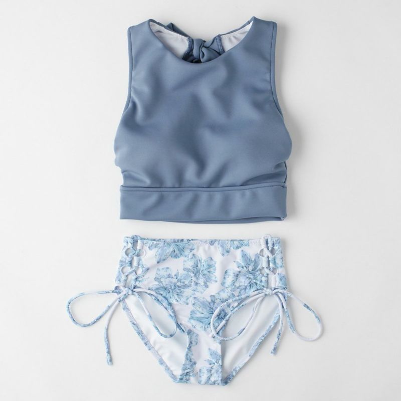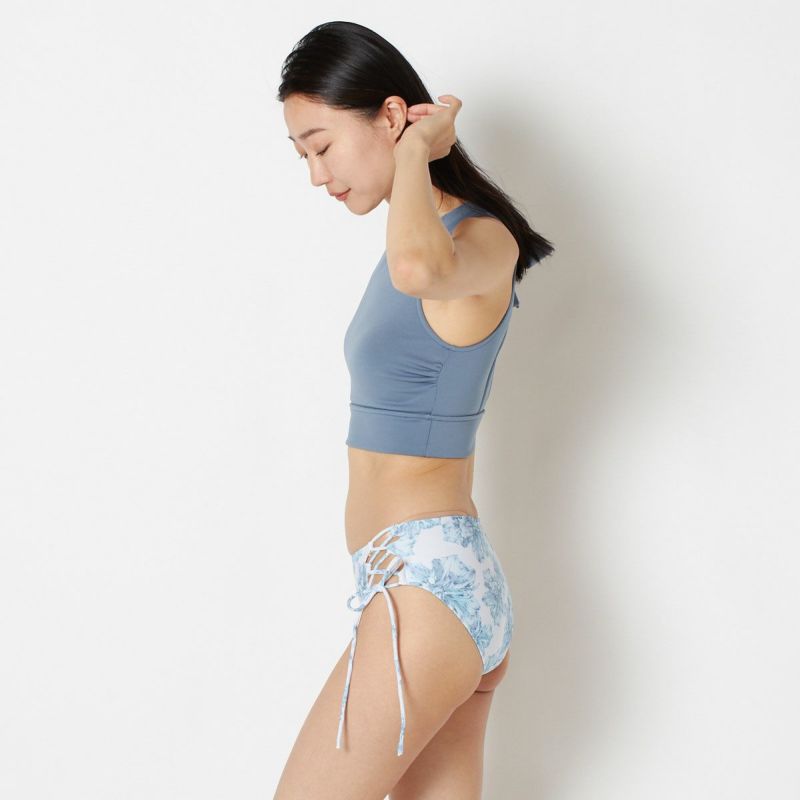 アクティブに遊びたい女性にもぴったりな、スポーティーなアメスリブラトップビキニ。後ろ首にあるフェミニンなリボンがポイントです。ショーツのプリントはブラシタッチのフラワー柄でヘルシーなデザインです。レースアップ対応なので、お好みに合わせてサイズを調節できます。裏地には透け防止素材を使用しています。