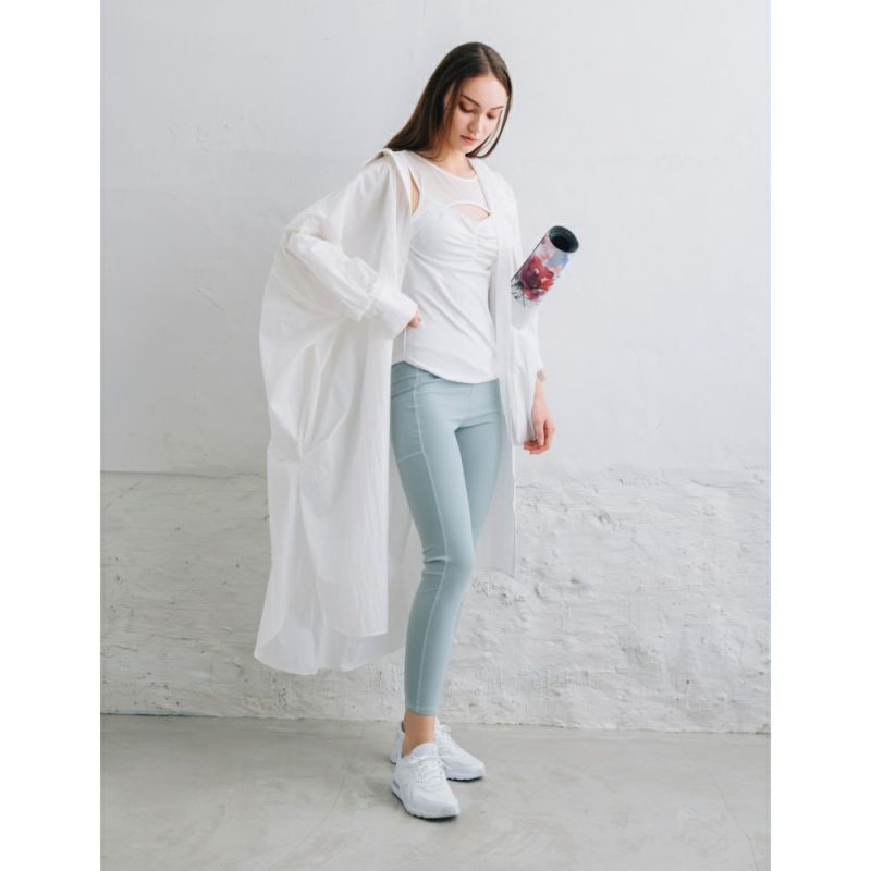 着る人それぞれのオリジナリティと美しい動作が引き立つ、モードで上質感のある女性のためのレギンスです。 ウエストクロスデザインで女性らしい肌見せが叶うと同時に、細見え効果も期待できます。 サイドにはスマートフォンやスタジオでの鍵の管理に最適な小物を収納できるポケットも備えています。 高品質なメリルハイテンション素材で、さらりとした肌触り/UVカット機能/接触冷感機能/ストレッチ機能でアクティブな動きのサポートを実現してくれます。
