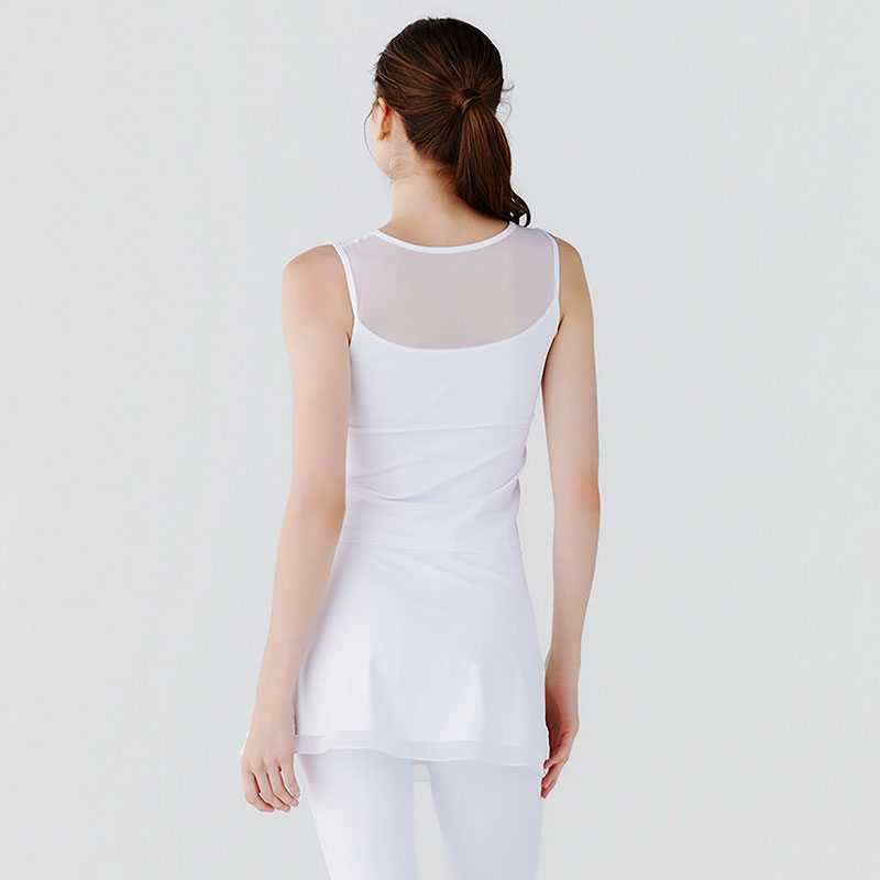 バストから上にチュールを重ねたデザインタンクトップ。ベーシックなシルエットにチュールの透け感を加えることで、シンプルながらエレガントに見せてくれるデザインです。露出を控えつつ、胸元の透け感が女性らしい印象にしてくれます。デザインはDOUBLE STANDARD CLOTHINGが監修しています。