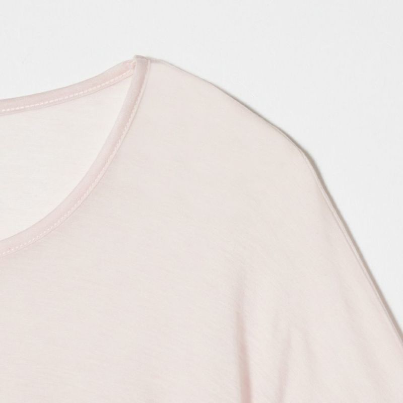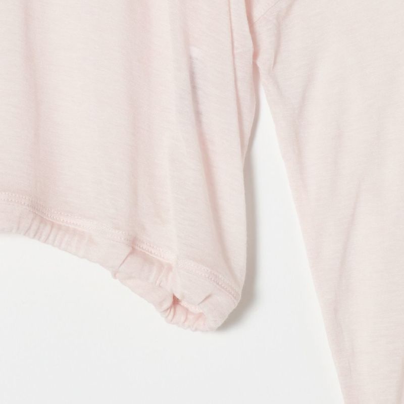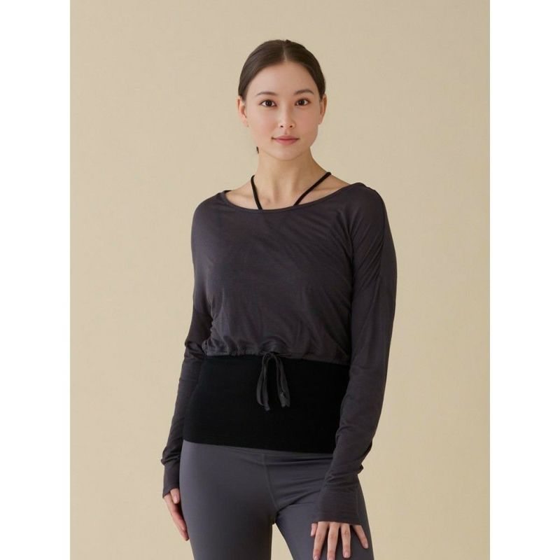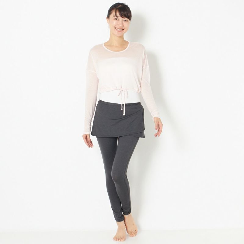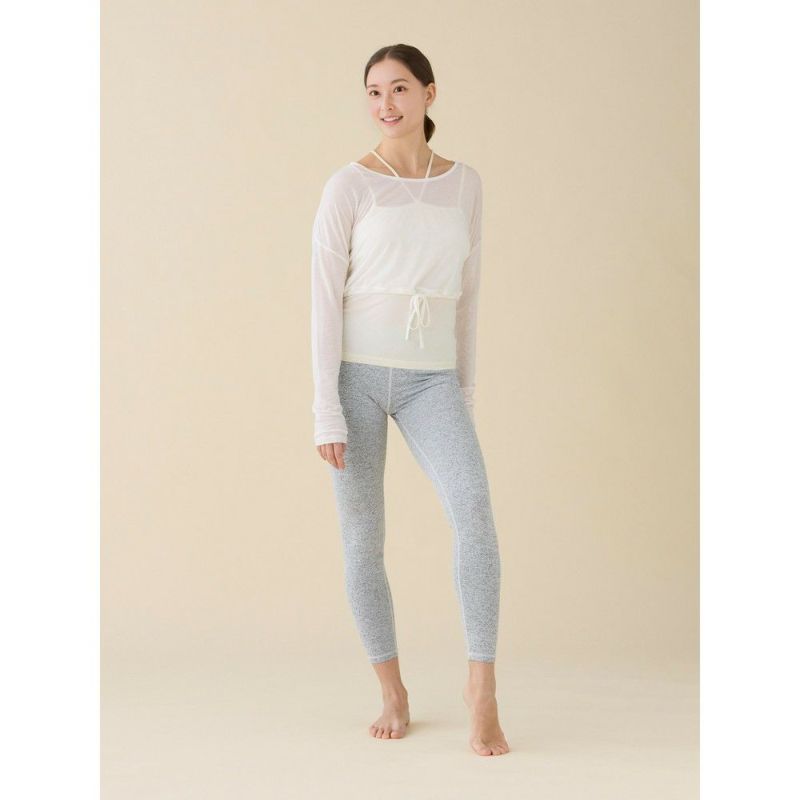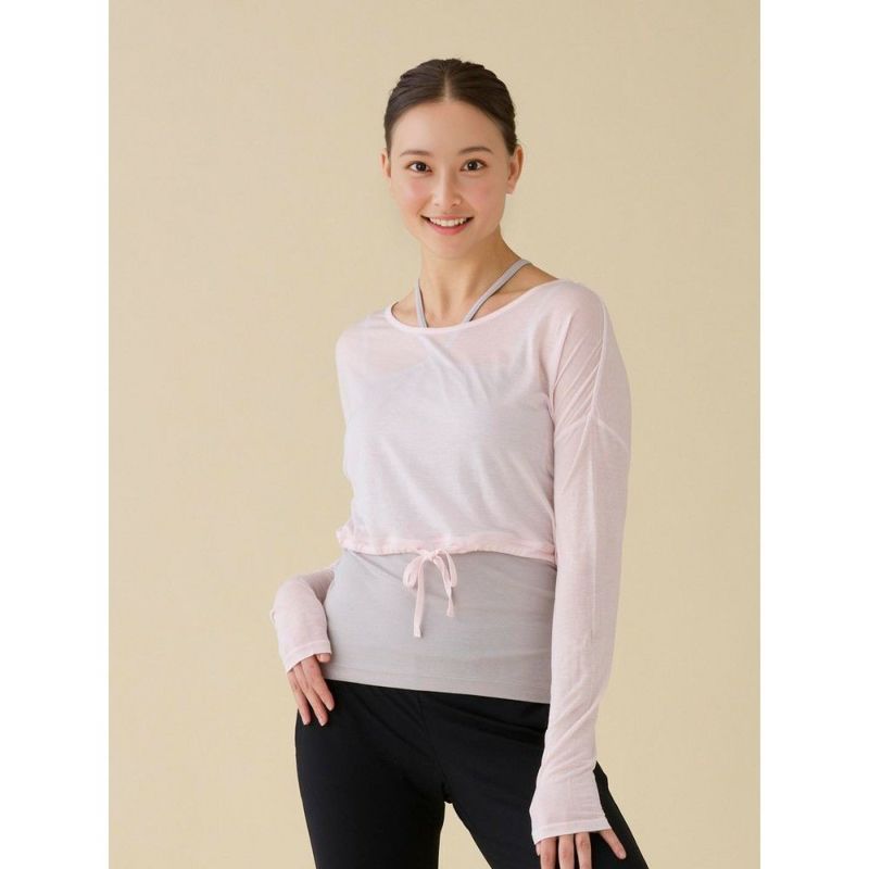 裾にゴムが入っているので調節が簡単な短丈のトップス。ゴムを締めればズレる心配が有りません。薄手でサラサラとした生地で着心地が軽く、蒸れる心配が少ないのでヨガにピッタリです。シルエットにはゆとりがあるので動きやすくなっています。インナーとの重ね着もしやすいアイテムです。