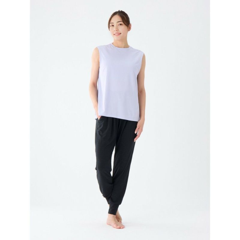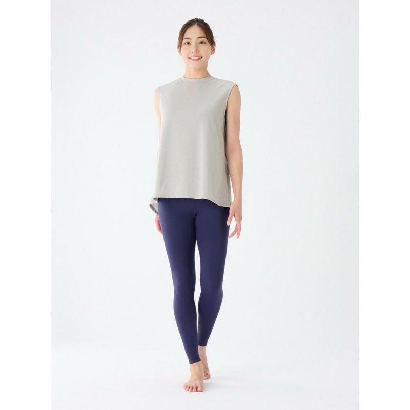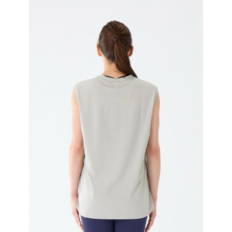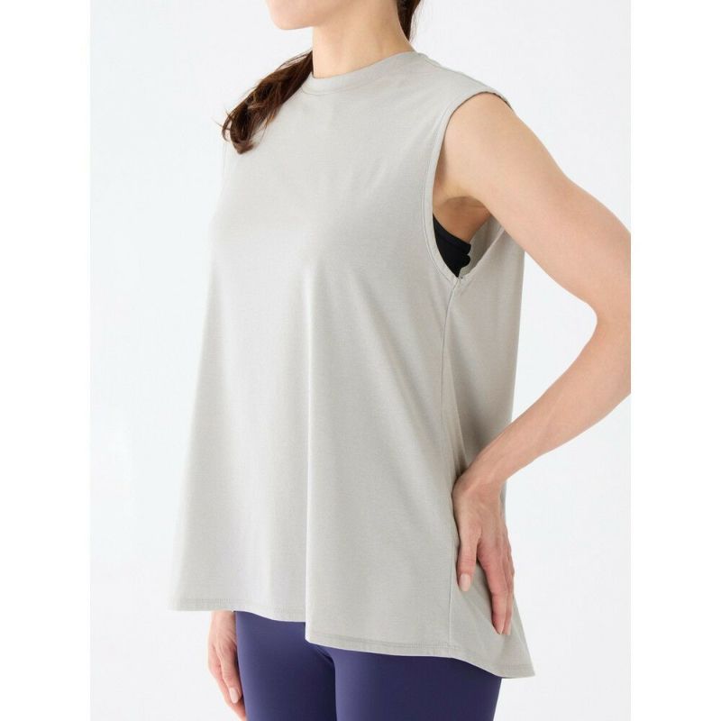 ホットヨガにもお勧めなゆったりシルエットの速乾タンク。シンプルなタンクに見えて肩幅が広くできており、二の腕の後ろ側に少し袖が被り、気になる腕周りをカバー。着丈が長いのでレギンスとのコーディネートもおすすめ。軽く乾きやすく、さらりとした肌触りで着ごこちも◎。