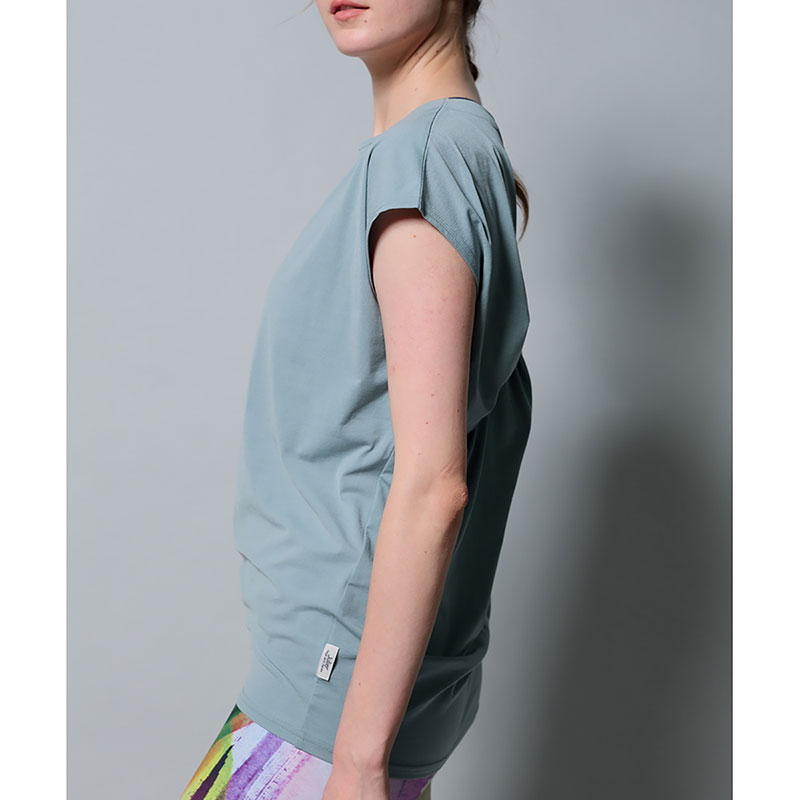 人気のチュニックに、ミントグリーン・ブルー・ネイビーの爽やかな新色が仲間入り。前はシンプル、後ろはクロスデザインと上品なドレープで、1枚でも着映え抜群です。広めの袖口が二の腕をすっきり見せ、お尻が隠れる丈感で安心感も。植物由来のエコ素材を使い、肌あたりも心地よく、高機能も魅力です。ヨガやワークアウトはもちろん、ボトムスにインして日常使いにもぴったりな一着です。
