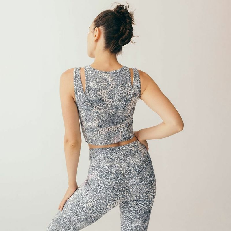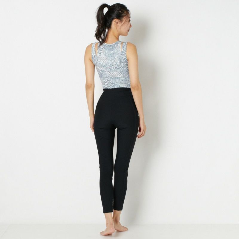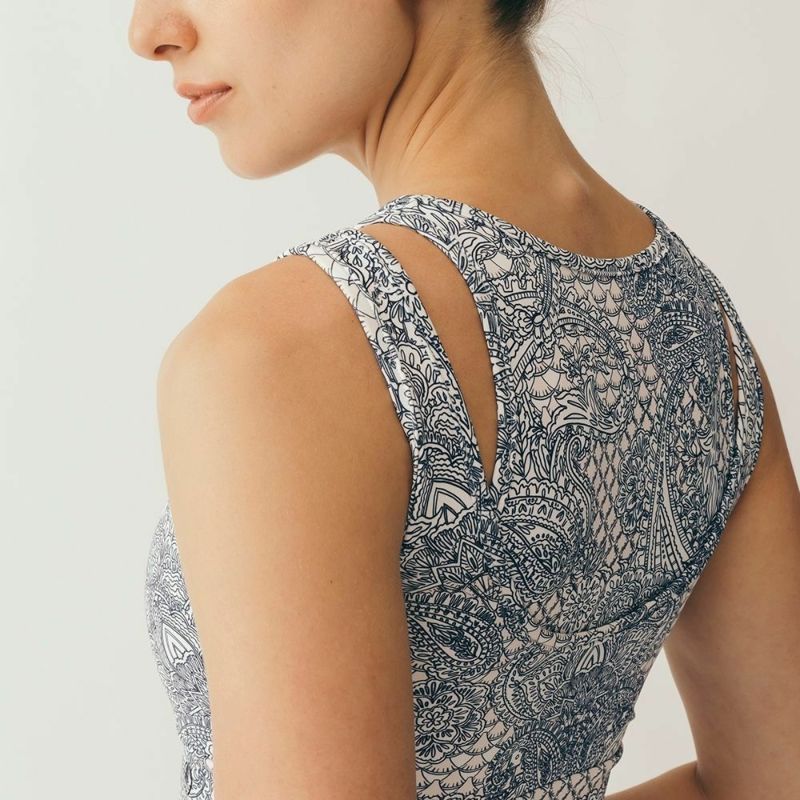 リジーオリジナルのプリントブラトップ。少し長めの丈感で露出を控えつつお腹周りをカバーしてくれます。首元もしっかりとカバーし安心感のある着心地。柔らかく伸びのよいストレッチ素材でなめらかな着心地です。淡いピンクとベージュの色合いが優しい、ニュアンストーンのアラベスク柄プリント。