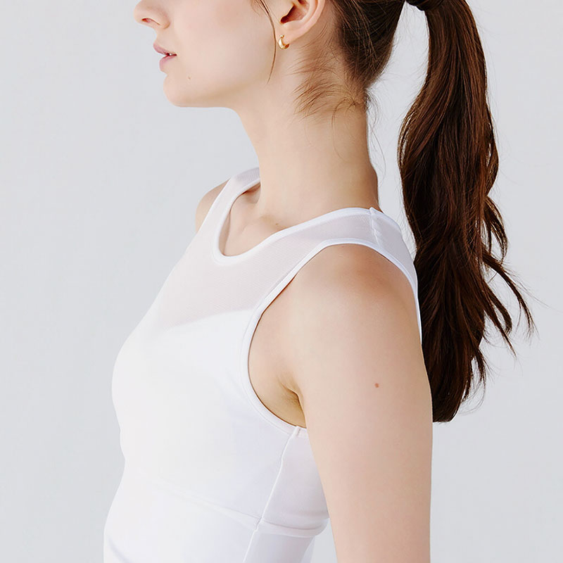 バストから上にチュールを重ねたデザインタンクトップ。ベーシックなシルエットにチュールの透け感を加えることで、シンプルながらエレガントに見せてくれるデザインです。露出を控えつつ、胸元の透け感が女性らしい印象にしてくれます。デザインはDOUBLE STANDARD CLOTHINGが監修しています。