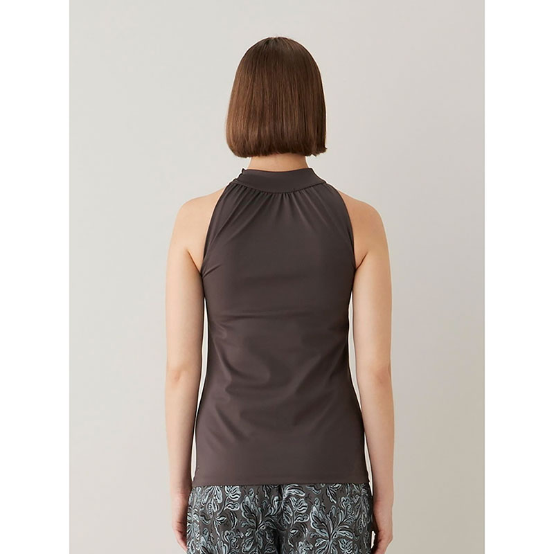 アメリカンスリーブが今年らしいデザインのカップ付きノースリーブです。左の首部分のボタンで開閉して着脱する仕様で、ボタンはスポーツウェアではあまり使わない高級感のある貝ボタンを、敢えて採用しています。動きを邪魔しないように全体的にコンパクトなサイズ感にしています。