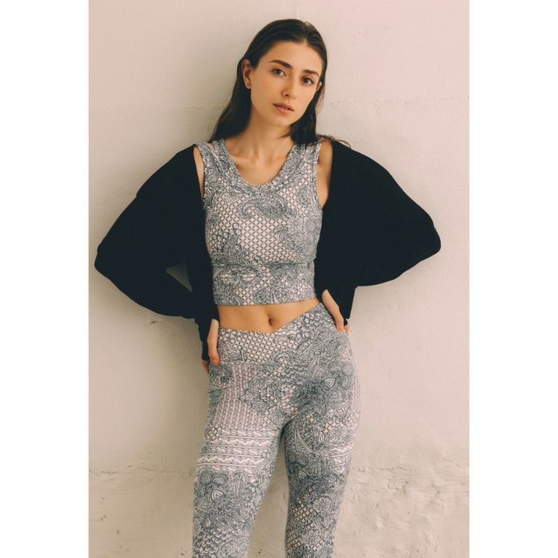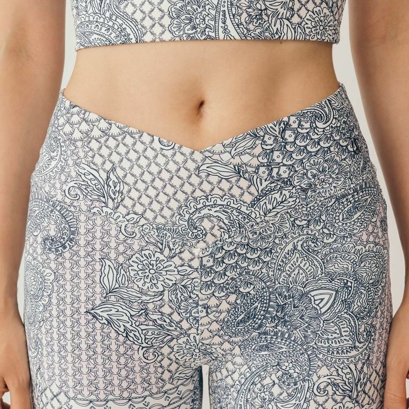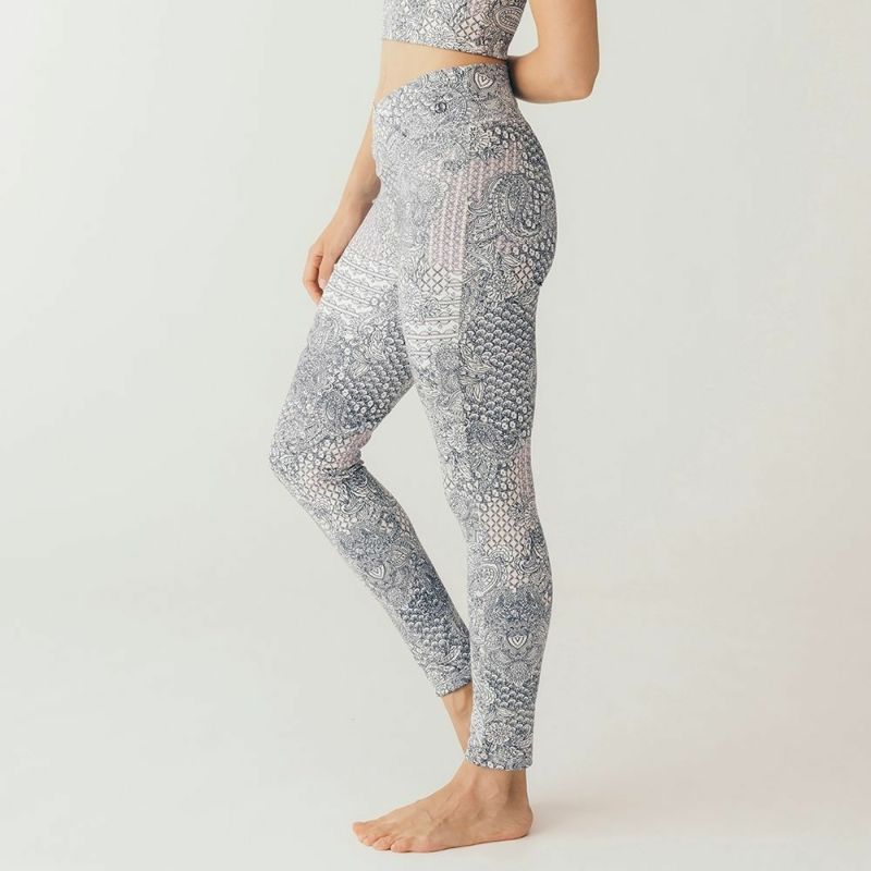 クロスデザインがウエストを美しく見せてくれるリジーオリジナルのプリントレギンス。柔らかく伸びのよいストレッチ素材でなめらかな着心地です。淡いピンクとベージュの色合いが優しい、ニュアンストーンのアラベスク柄プリント。