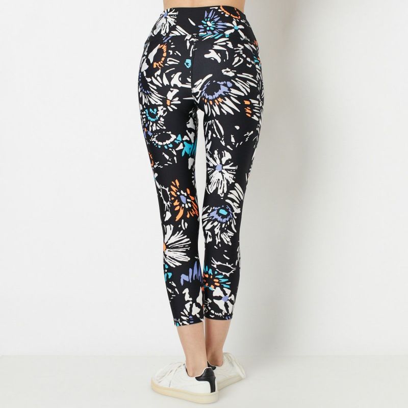 鮮やかなフラワープリントが目をひく7分丈レギンス。生地の程よい厚みと優れたストレッチ性で、足をキュッと引き締めてくれます。ウエスト部分は二重になっており、生地のストレッチ性を活かしながらお腹にフィットします。右もも部分にはウォーターボトルを収納可能なポケットがついています。