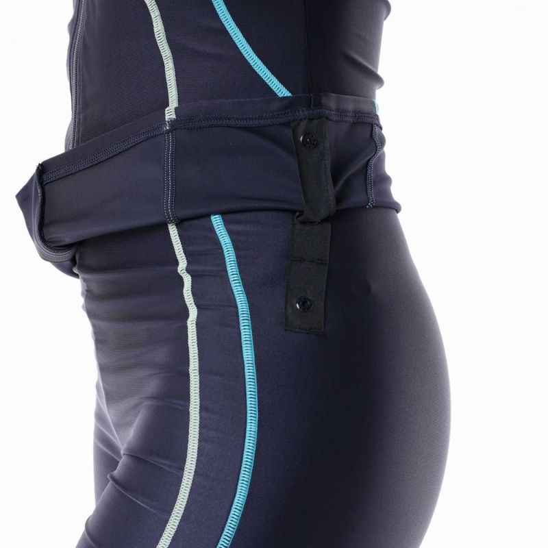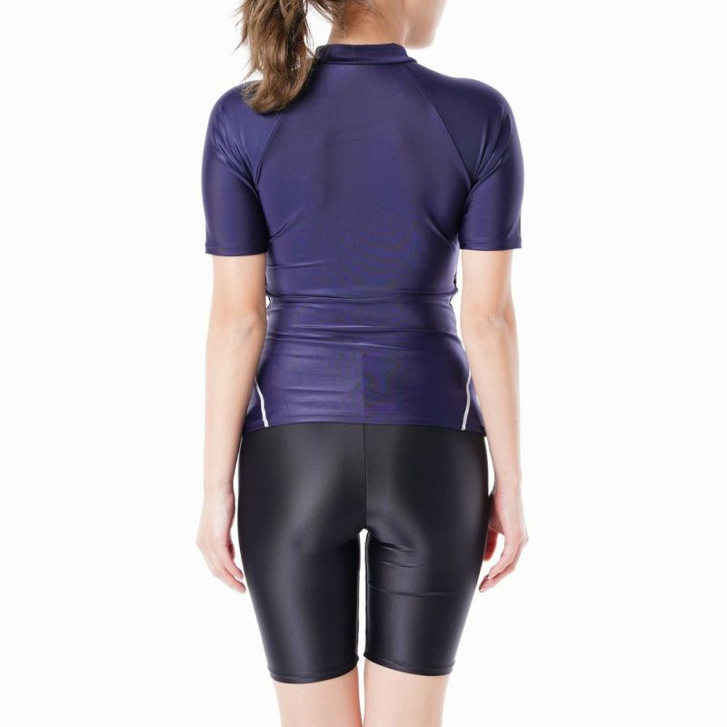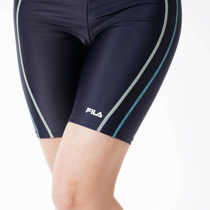 ファスナー付で着脱が楽なセパレーツ水着。股下19cmのボトムセット。お好きなカップに取替えできる挿入カップ式。15mmのゴムがアンダー内側に入っていて胸を固定してきれいにみせてくれます。袖付きなので二の腕もカバー。襟元がスッキリ見えるパターンです。体に沿った切り替えと2本ステッチの視覚効果で脇ラインがシャープに見えます。ボトムの前部分はすべて伸びの良い裏地付。ウエストはスピンドル入りで調節できます。めくれ防止機能付。 FILAのロゴプリント入り。