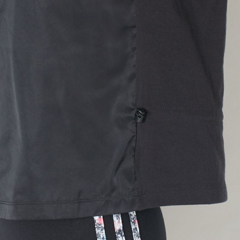 フロントをマットな質感の光沢生地で切り替えた、異素材切り替えデザインがおしゃれ見えを叶えてくれるトップス。ゆとりのあるシルエットなので締め付け感が無く、通気性も抜群です。両腕に入ったフローラルプリントのラインがアクセントになっています。ウエスト部分をドローコード絞ったスタイリングも可能です。